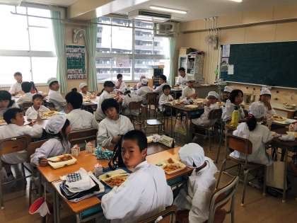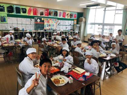 今日は、4時間目に1年生と6年生でオリエンテーリングを楽しく行った後、同じグループのメンバーで一緒に給食を食べました。