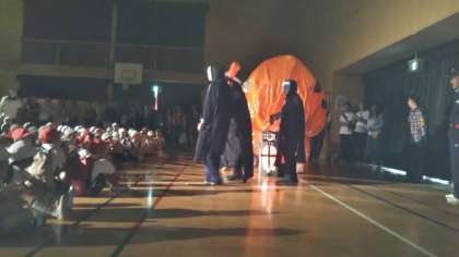 朝から低学年年の児童が、とらわれた校長先生を助ける為に、クイズやゲームに参加しています。