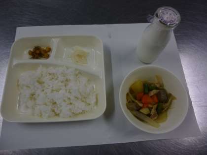 今日は和風メニューでした。じゃこ豆は、カリッとした食感としょう油風味で子どもにも大人にも大人気です。