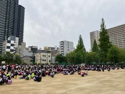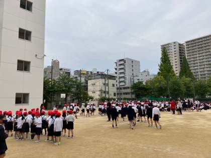 本日は土曜授業でした。午前10時55分に、大阪市で震度6の強い地震が発生したと想定し、運動場へ避難し、さらに津波警報が発令されたと想定して校舎3階以上に避難する訓練を行いました。どの学年も、先生の指示を聞いてすばやく行動ができていました。その後、保護者の方のお迎えにより帰宅しました。