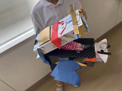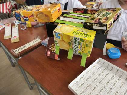 1年生図工科の学習では、様々な形や大きさの箱を組み合わせて、動物や乗り物などを作りました。組み合わせから、イメージがどんどん広がって作りたいものが変化していきました。友達の作品を眺めながら、「かっこいい。」「どうやってつくったん?」など話をしながらの学習になりました。