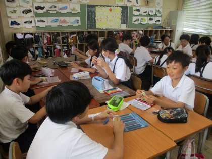 今回はチームのバッジづくりをしました。5年生が描いた絵に、みんなで色を塗り、それぞれのチームの個性が光るバッジが出来上がりました。