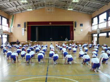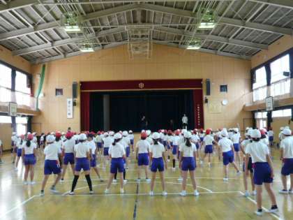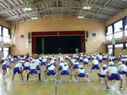 各学年とも、運動会に向けた取組が始まっています。今日は、4年生が講堂で学年演技の練習をしました。先生のかけ声に合わせて、1つ1つの動きを確認しながら練習しています。