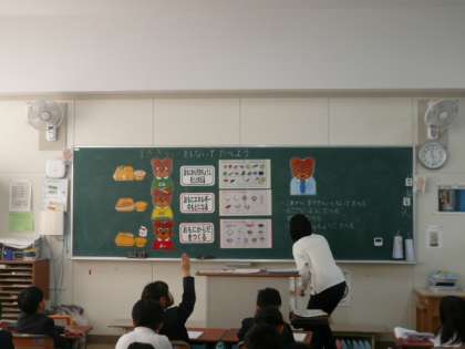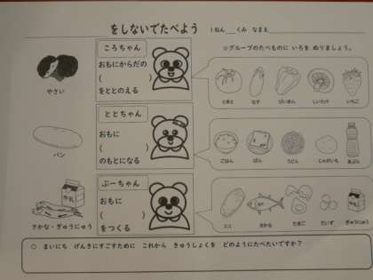 毎日元気に過ごすために、すききらいをしないで食べることが大切であると学びました。また、すききらいをしないためにはどうしたら良いかについて考え、「のこさずにぜんぶたべる」「にがてなものでもがんばってたべる」など、たくさんの意見が出ました。