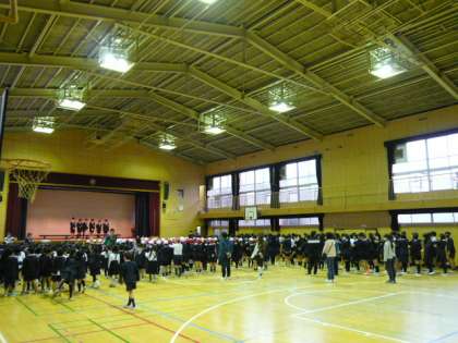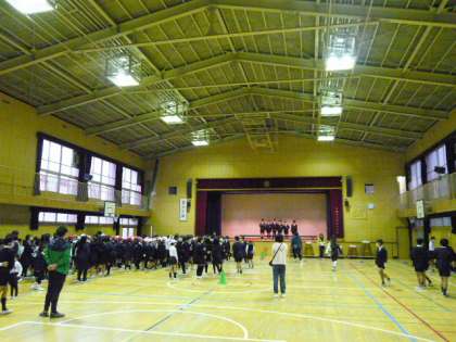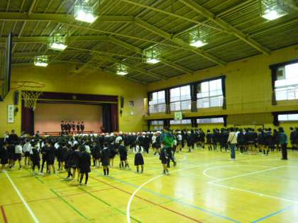 今日は雨なので体育館で、1,3,6年生が集まって、集会委員会のみんなが考えた○×クイズで楽しみました。