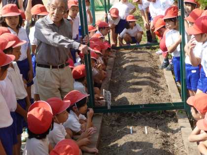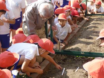 今年も石橋先生をお招きして「天王寺蕪」の種をまきました。栽培・収穫のあと、実際に食することをみんな楽しみにしています。順調に成長してくれますように!