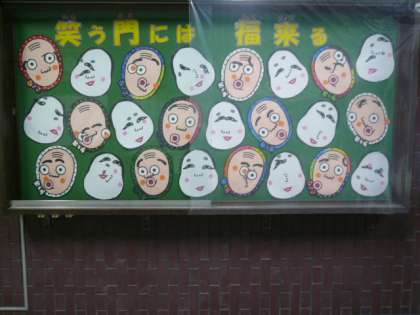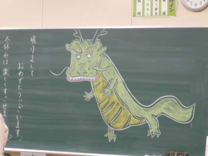 新学期の始まりに合わせて、玄関の掲示板は、5年生の作品で表情豊かな福笑いのお面になりました。「笑う門には福来る」の言葉通り、鷺洲小学校に笑顔があふれ、子どもたちを始め関係する全てのみなさまにたくさんの幸せが訪れる年になるよう、また今年の干支の龍のように、運が上昇して夢が叶う年になるよう、願っています。