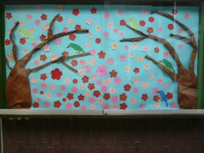 玄関を彩る掲示板は、今月は4年生のすてきな作品です。梅の香りが漂い、うぐいすの鳴き声が聞こえてくるようです。