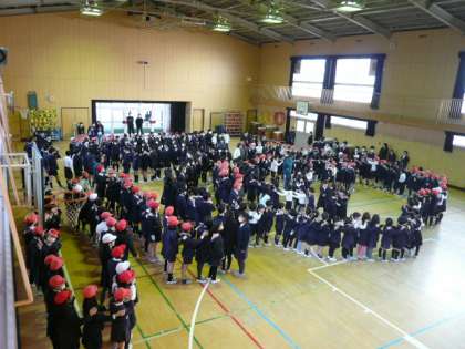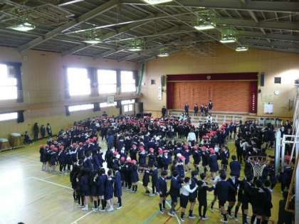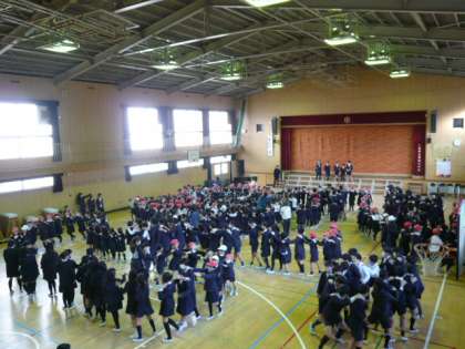 今日の1,3,6年生の児童集会では、講堂で「じゃんけん列車」をおこないました。約束事は「絶対に走らないこと」です。