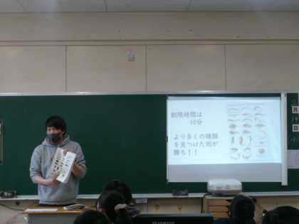 本日(水曜日)午前、八阪中学校からお2人の先生がお越しくださり、6年生へ「出前授業」をおこなってくださいました。