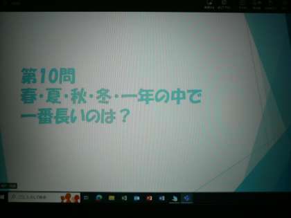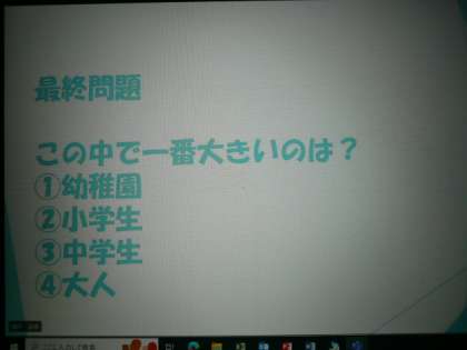 今日はオンラインで、今年度最後の集会でした。先週に引き続き、集会委員会のみなさんが工夫をこらしてつくってくれたいろいろなクイズで楽しみました。