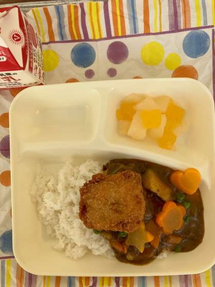 「カツカレーライス」は牛肉を主材としたカレーライスに、一口とんかつを添えていただきました。ラッキー人参も入っていて児童に大好評でした。