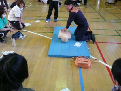 本日(水曜日)放課後、教職員の「救急救命講習」をおこないました。先月に続き、講師として福島消防署の方にお越しいただき、心肺蘇生とAEDの使い方等について学びました。