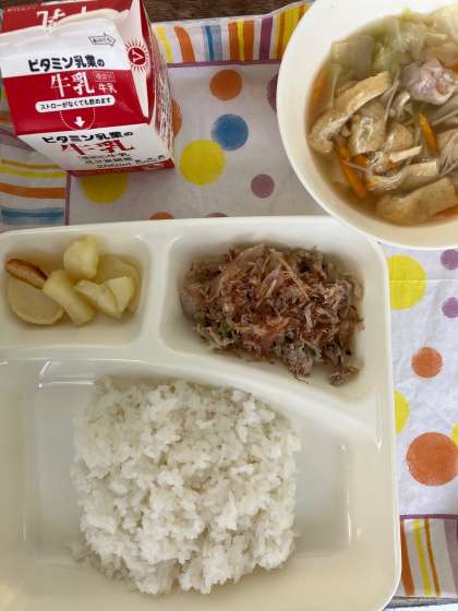 かつお節が1人1袋つきます。食べる前にかつお節をかけることで、風味と旨味を添えています。