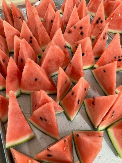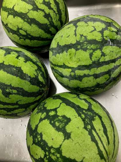 今が旬の「すいか」は、1年に1回登場します。1玉のすいかを64個に切りわけます。鷺洲小学校は16玉のすいかを切りわけました。