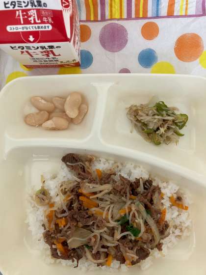 「牛丼」は、児童に人気の献立で、牛肉、糸こんにゃく、玉ねぎ、にんじん、えのきたけを炒め煮にし、甘辛く味付けしています。斜め切りの青ねぎで彩りをよくしています。
