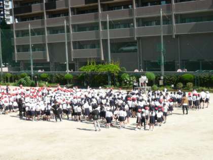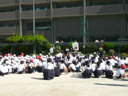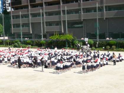くろさぎ班(1,3,6年生)は運動場、しらさぎ班(2,4,5年生)は講堂で、たてわり班で集合しました。