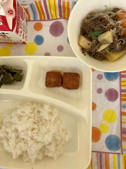 「肉じゃが」は、牛肉、じゃがいも、糸こんにゃく、玉ねぎ、にんじん、青みにさんど豆を使用した児童に人気の献立です。