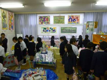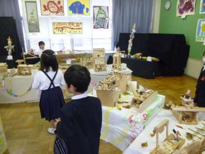 1年生の子どもたちが、貫江田幼稚園の作品展「キッズフェスティバル」を見に行かせてもらいました。1年前は自分たちもこうだったのか、と思い出しながら、園児の力作に見入っていました。すばらしい作品が並んでいました。