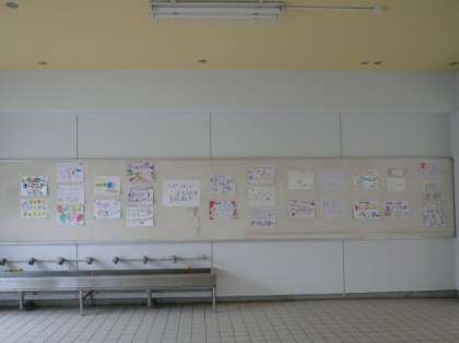 各クラス、たくさんのお客さんに楽しんでもらえるようにと、いろいろな工夫をこらし、今日までいっしょうけんめい準備をしてきました。ピロティには、各クラスのお店を紹介するポスターをクラスで作成して掲示しました。