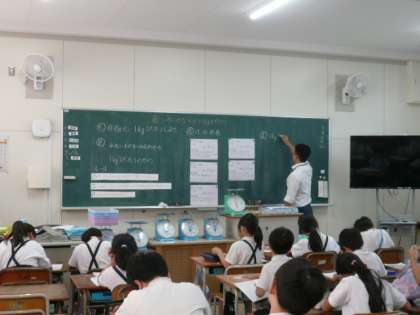 3時間目の研究授業は、新任教員(1年目)の校内研修として、3年1組での算数の習熟度別学習です。「重さ」の単元で、今日のめあては「めざせ、1kgぴったりしょう!」です。身のまわりにある物を使って1kgをつくるためにはどうすれば良いか、などについて、ルールにもとづいていろいろな方法を考えたり試したりしました。みんなとても熱心に、考えたり発言したりしていました。