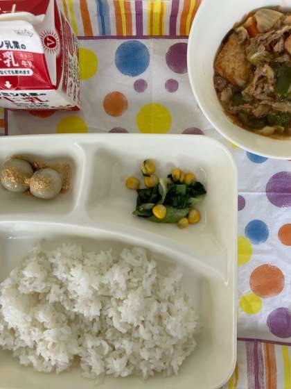 今日の給食では、豚肉、厚揚げ、はくさい、にんじんを使用し、塩、濃い口しょうゆ、赤みそを合わせた調味料で味付けし、トウバンジャンで辛味をきかせ、水どきでん粉でとろみをつけています。