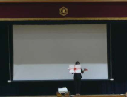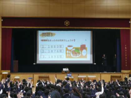 プログラム1番「給食調理員さんありがとう」では、毎日おいしい給食を作ってくれている人たちへ、各クラスでつくった「給食調理員さんへの感謝の手紙」を渡して感謝の気持ちを伝えました。プログラム2番「給食委員会による給食クイズ」では、学校給食について考える三択クイズで楽しみました。