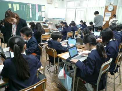 5年生では毎日いろいろな学習でタブレット端末を活用しています。今回の研究授業でも、友だちと意見を交流したり友だちの意見を聞いて自分の考えをまとめたり、文章を書く時も後で付け足したりつないだりと、有効に活用して学びを深めることができました。