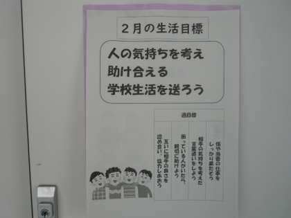 毎週月曜日は、全校朝会の日です。校長先生からは、2月2日の節分についてのお話がありました。「みなさんは豆まきをしましたか。『鬼は外、福は内』と言いますが、鬼は外にだけいるのではありません。校長先生は、自分の心の中にいるよくないところを外へ出そうという気持ちで「鬼は外」と思っています」等のお話でした。