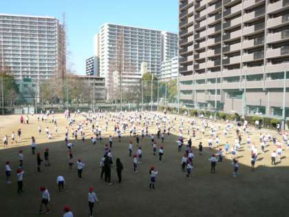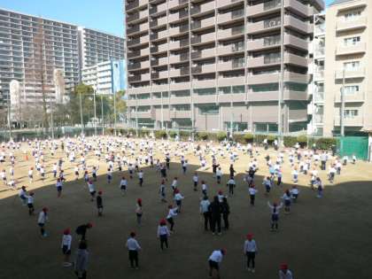 2,3限の休み時間に、低学年・中学年・高学年それぞれの割り当てを決めて運動場に出て、自分の体力と楽しい音楽に合わせて、元気になわとびに取り組んでいます。