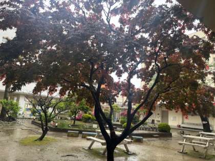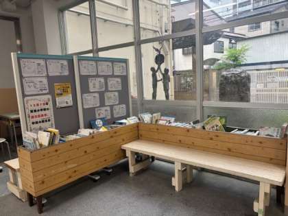 玄関には、読書コーナーがあります。朝の雨は、昼にはやみました。雨の日で運動場には出ることができな日は読書もよいかもしれません。