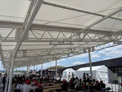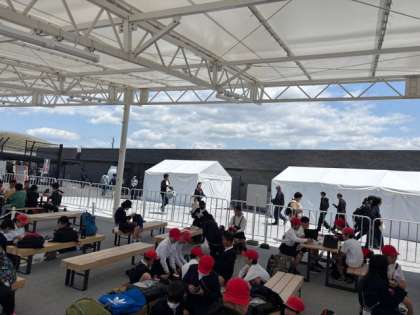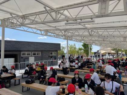 お弁当タイムです。みんな嬉しそうです。団体休憩所は、日陰です。ベンチもあります