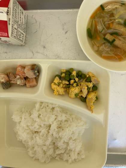 「えんどうの卵とじ」は、鶏肉とえんどうを砂糖、みりん、うすくちしょうゆで味付けし、卵でとじます。