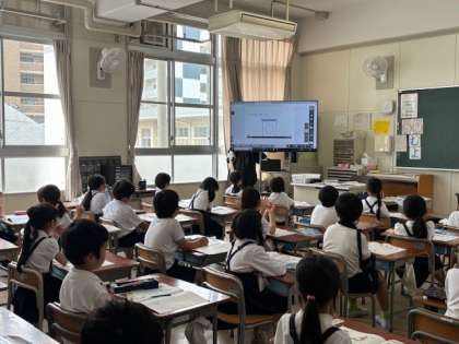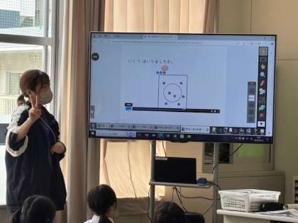 算数の学習の様子です。大型ディスプレイを使って、円の中に入ったおはじきを一緒に数えています。