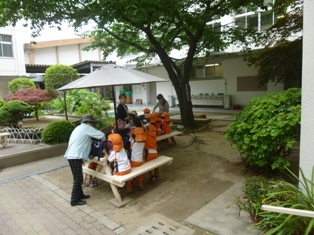 さわやかな気候のこの時季、近隣保育園の園児(年長さん)が本校中庭でお弁当を食べる「中庭ランチ」が春の恒例行事となっています。来年度、本校に入学予定の園児には、よい出合いとなったことでしょう。