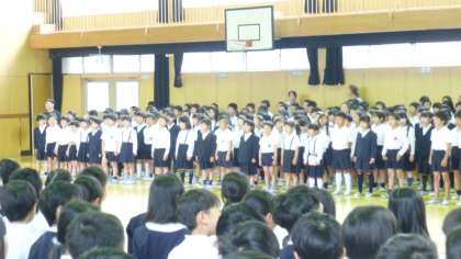 今日は、新しい学年になって初めての音楽集会でした。集会担当の先生から「体に力を入れずに、両足に体の重みをのせて、歌う時の“姿勢”に気を付けながら歌いましょう」と、今月の歌『校歌』を歌いました。
