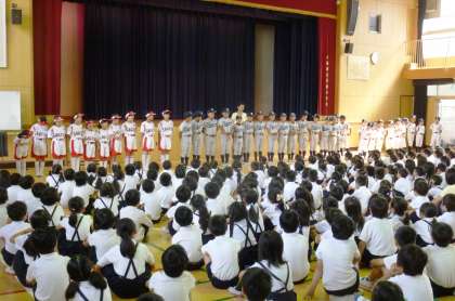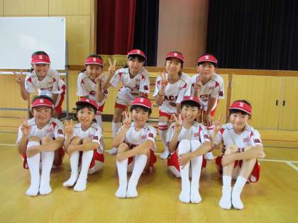 一人一人がユニフォームに着替えて前に立ち、先日行われた試合の結果や日頃の練習の内容、ポジション等を発表しました。そして、最後には「少しでも『やってみよう!』と思った人は、ぜひ入ってください。」と勧誘のことばがありました。