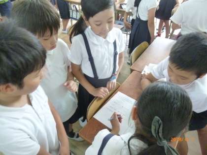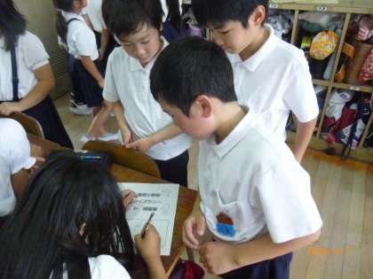 明日は、3年生と5年生が一緒に海遊館へ遠足に行きます。今日は初めての顔合わせで3年生が5年生にインタビューに来てくれました。3年生が到着し、自己紹介をするとあっという間に打ち解け、海遊館で行ってみたいところを話して盛り上がっていました。