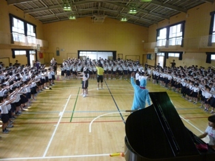 毎月の最終金曜日に全校で音楽集会をしています。今月の歌は「ビリーブ」。この日に向けて、音楽の時間や終わりの会で練習してきました。集会委員会の5・6年生は、低学年に手話を教えてくれました。全校児童の歌声が響き、講堂は一体感に包まれました。