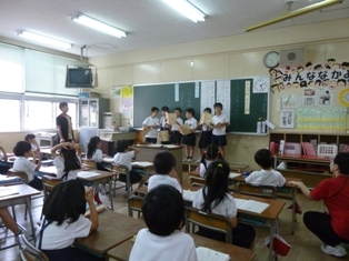 今回は、1・2時間目に学習参観がありました。たくさんの保護者の方に見ていただき、子ども達には励みになりました。4年生では、恒例の食育の出前授業もありました。写真は、1年生国語「よんでねきいてね」、2年生「町たんけんの発表会」です。