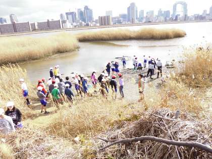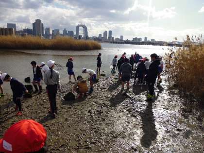 総合学習の一環で十三方面の淀川干潟に行きました。気温は低かったものの、きれいにできた干潟でカニを探したり、シジミを見つけたりしていました。中には水をすくって観察している子もいて、淀川の環境への意識の高さを感じました。これからの総合学習が総合学習がどうなるか楽しみです。