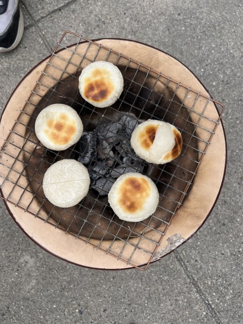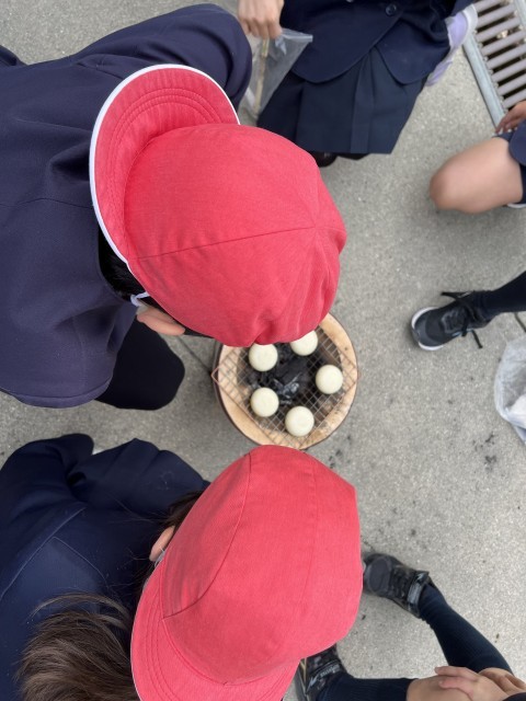 3年生は、社会科の学習で昔から使われてきた道具「七輪(しちりん)」でおもちを焼きました。はじめに七輪のしくみについて学び、空気の通り道があることで火がよく燃えることなどを知りました。実際におもちを焼く体験をすると、炭が燃えるのに時間がかかったり、うちわであおぐのが大変だったり、昔の人は毎日やっていたと思うとすごいね、と言っていました。また、子どもたちは網の上でふくらんだり割れ目が入ったりするおもちの様子を興味深そうに見ていました。焼きあがったおもちは、みんなでおいしくいただきました。昔の道具について学ぶことができ、とても貴重な体験ができました。