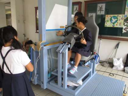 いきいきのところのだんさをあがる時に、ななめになったので、少しこわかったです。地面が少しでこぼこしている所は、がたがたゆれました。車いすに乗っている人も、たいへんだな、と思いました。