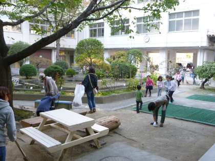 11月3日「見守りありがとうコンサート」の準備に来てくださったPTAの方や児童が、中庭をきれいに掃除してくださいました。