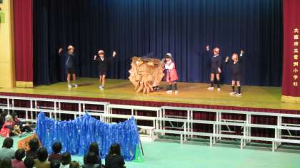 発表は第一部4年生「木竜うるし」に始まり、2年生の「サラダでげんき」、第二部では5年生の「大造じいさんとがん」と2年生の「さぎっ子放送局 ズームイン!!サギス」、第三部では3年生の「大阪環状線一周の旅〜大阪ええとこ発見!〜」に続いて6年生の「The Peach Boy(桃太郎)」が最後を見事に飾りました。