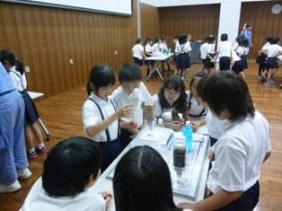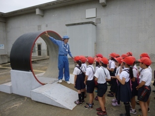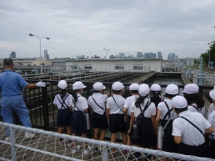 柴島浄水場に見学に行きました。淀川から取水した水がだんだんきれいになっていく工程を間近に見ることができました。できた水を市内に送る配水管の大きさにはびっくりしました。実験コーナーでは、汚れた水も砂の層を通すときれいになり、活性炭だと臭いまでとれるということを体験できました。