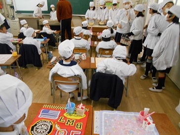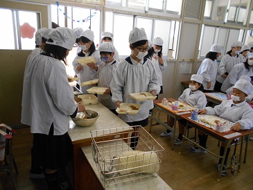 6年生は、1年生の教室へが早めに食器や牛乳、主食・副食を運んで、配膳をしてくれています。さすが6年生です。手際よく配膳をしています。