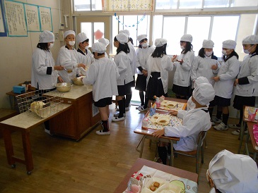 来週の半ばから1年生も自分たちで給食室へ取りに行き、配膳をします。6年生の様子をしっかり見て、配膳の仕方をしっかり覚えておきましょうね。