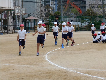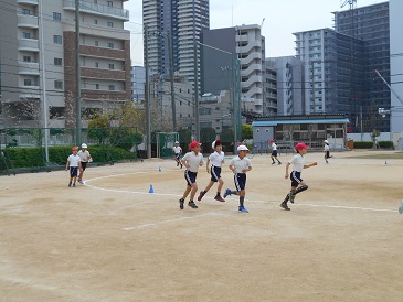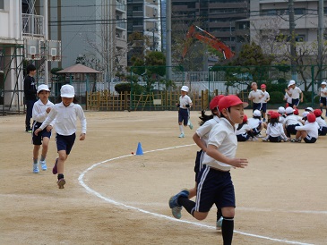4月17日(水)3年生が体育で5分間走に取り組んでいました。春の風が気持ちよく、持久走に取り組むのにいい気候になりました。子どもたちは、自分に合ったペースの配分を考えながら、一生懸命走っていました。