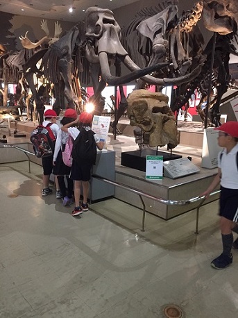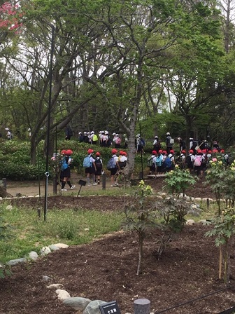4月19日(金)3.4年生が長居公園へ遠足に出かけました。最初に自然史博物館を見学しました。恐竜の骨の展示物にみんなびっくりし、歓声を上げていました。そのあと、植物園を散策していました。色とりどりの春の花がさいて、とてもきれいでした。